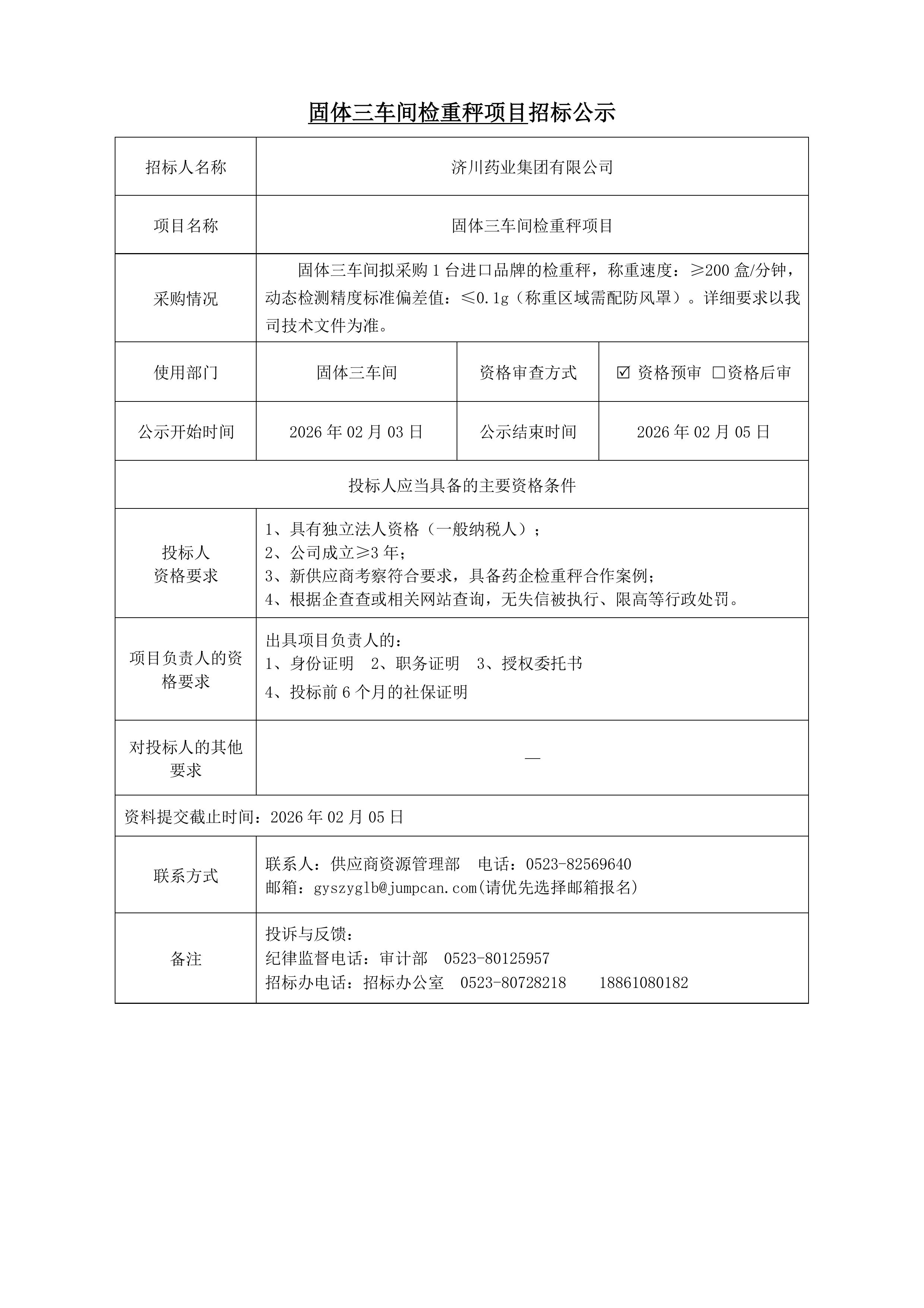 固体三车间检重秤项目招标公示