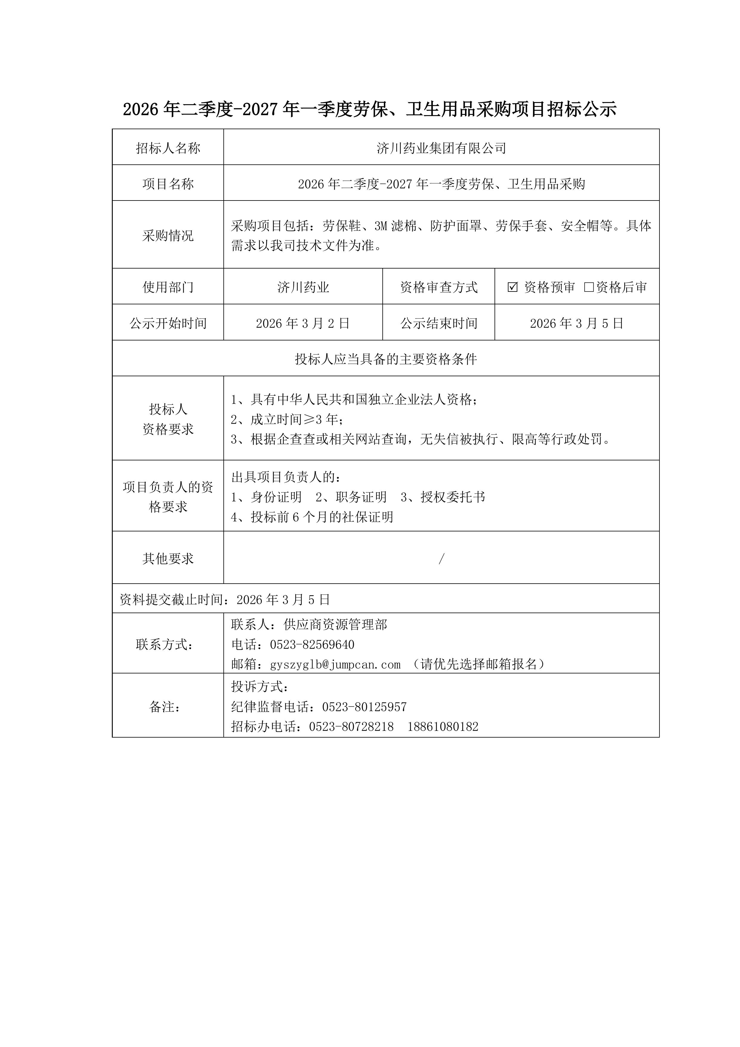 2026年二季度-2027年一季度劳保、卫生用品采购项目招标公示