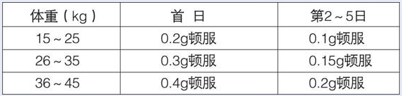 顿服(一日最大量不超过0.5g(5袋)),第2~5日,每日按体重5mg
